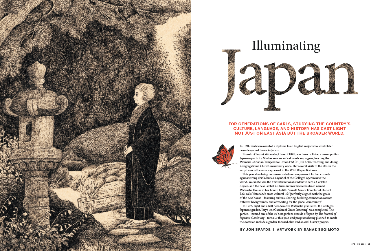Illuminating Japan: A look at how Japan Studies at Carleton has for over 100 years cast a light not just on the East Asian country but the broader world. With illustrations by Fukuoka-based artist Sanae Sugimoto.