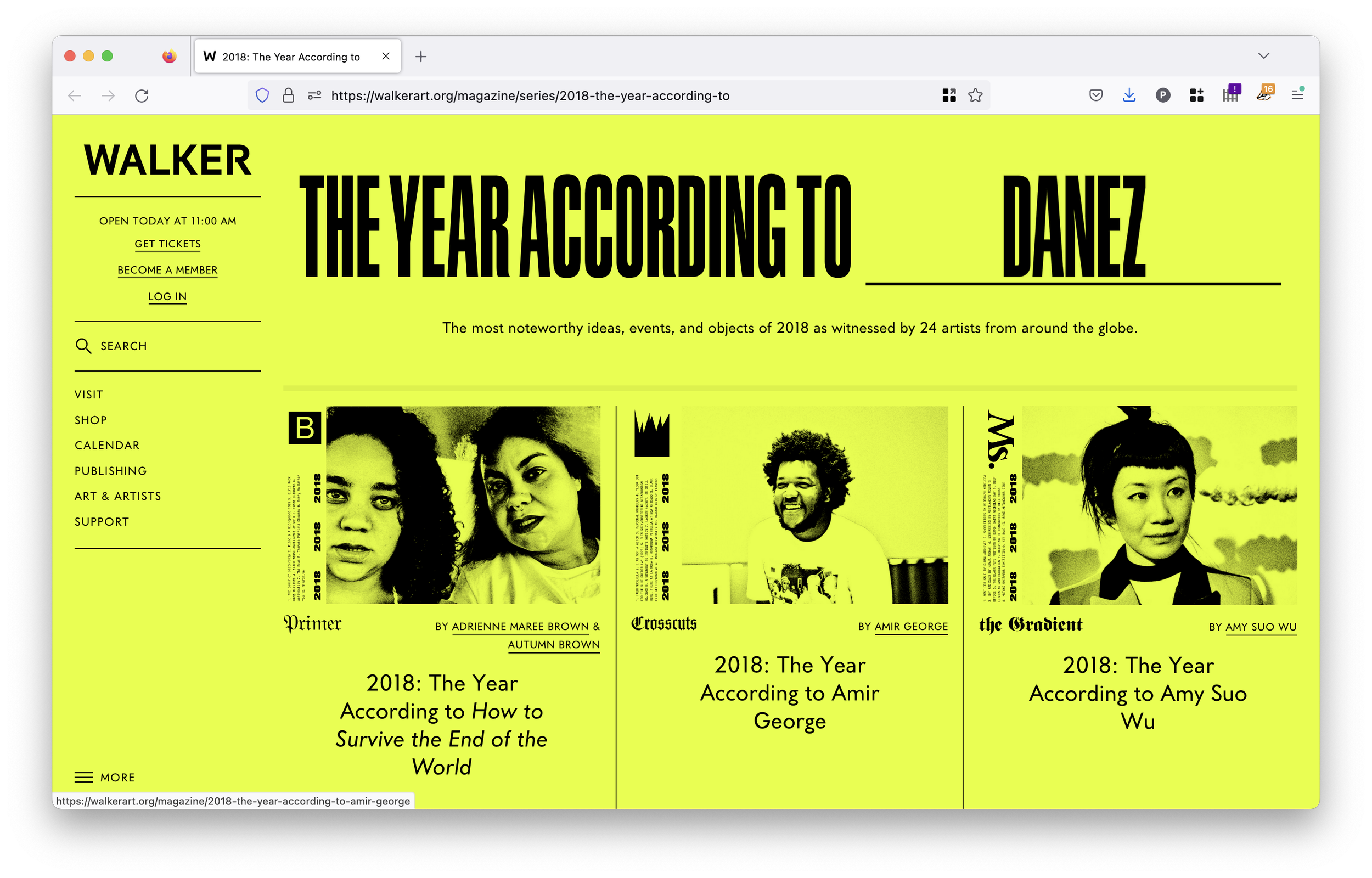 In lots of ways, the year-end list represents the worst of the internet: quick, easy, consumerist, cliche. But at the Walker Art Center, I saw the format’s opportunity to both engage with readers and fulfill the museum’s values as a diverse, multidisciplinary, global, and questioning place—and one committed to spotlighting the voices of artists. I also thought of it as a sort of Trojan Horse, using a form most associated with capitalist choices and popularity to serve up unexpected and unusual perspectives.